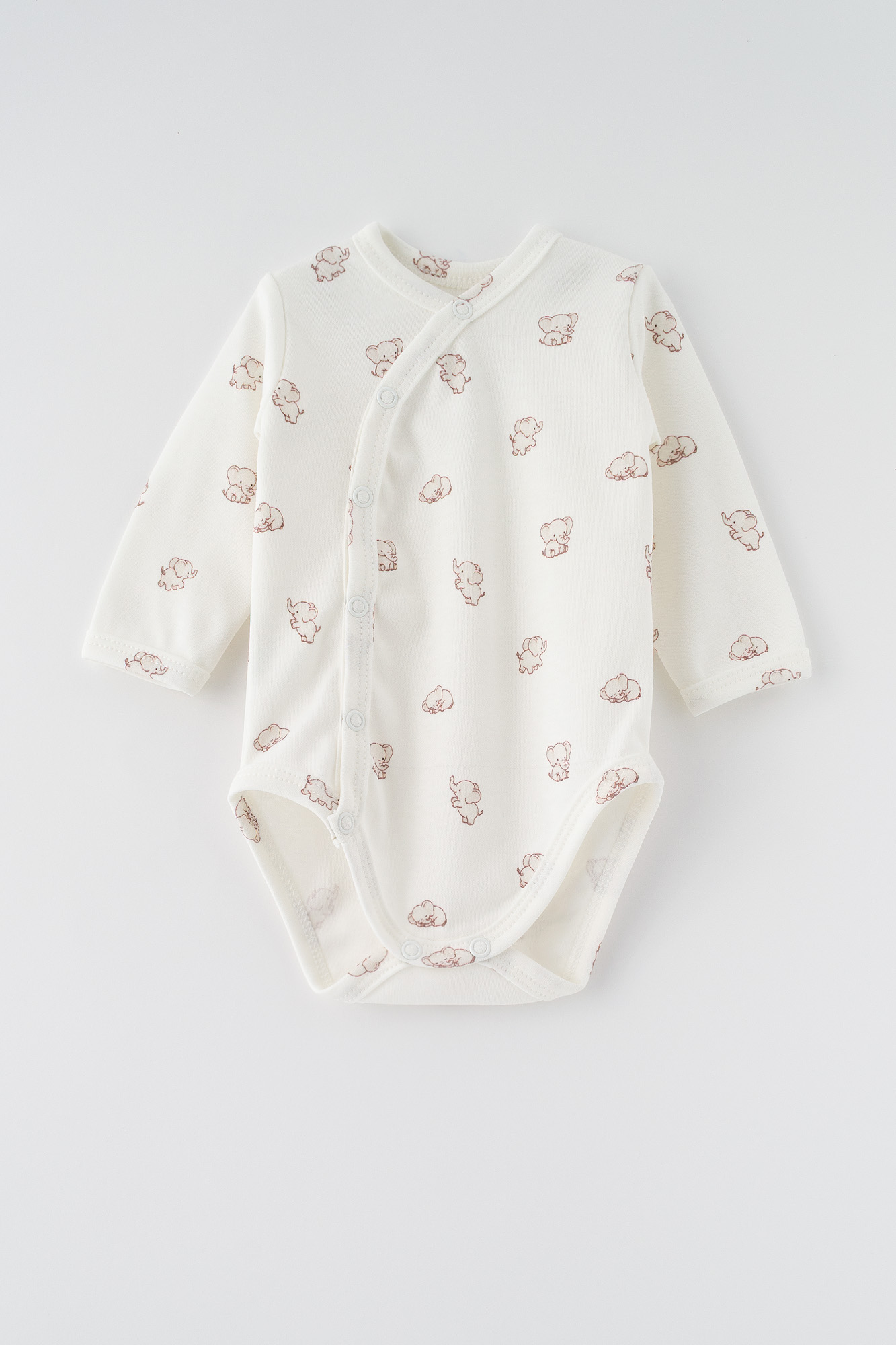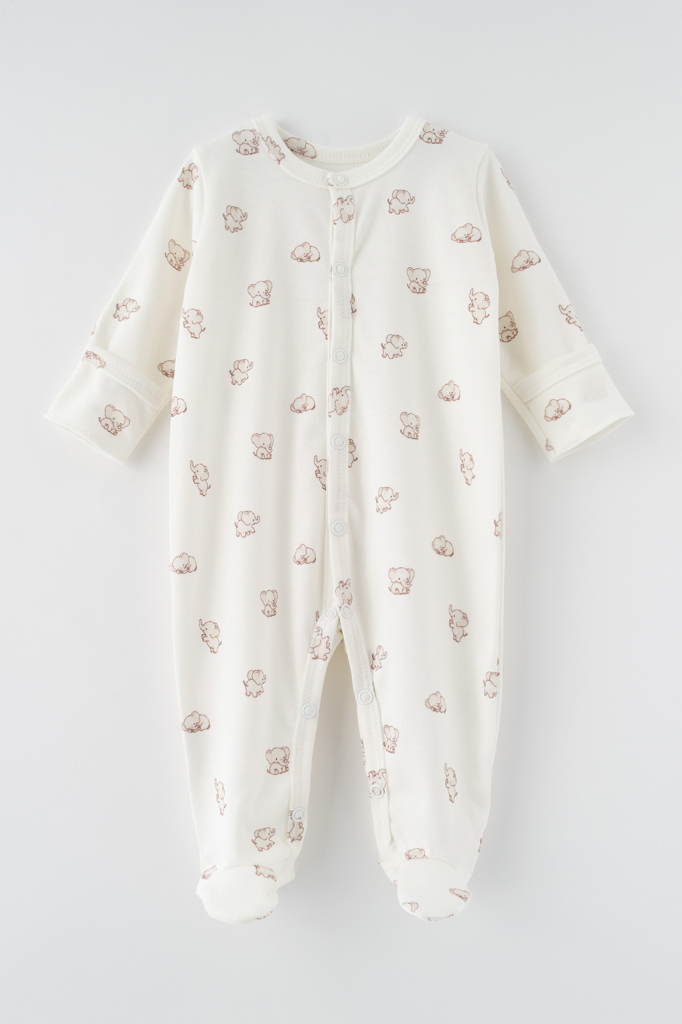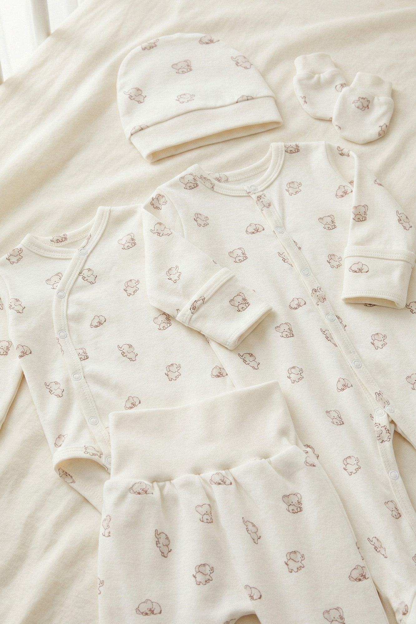 Ten uroczy zestaw niemowlęcy to kwintesencja delikatności i komfortu, idealny na pierwsze dni życia maluszka. Wykonany z miękkiej, oddychającej dzianiny w kolorze ecru w uroczy wzór słoników. Zestaw zapewnia najwyższą wygodę i swobodę ruchów.